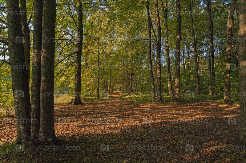 Полоски света и тени на опавшей листве на тропинке в осеннем лесу. Начало сентября. Битцевский лесопарк, Москва, Россия