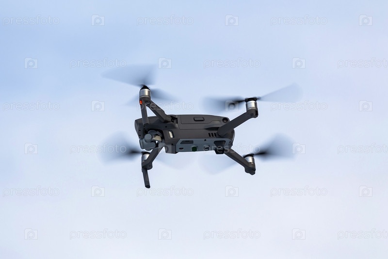 Дрон с видеокамерой на фоне ясного неба