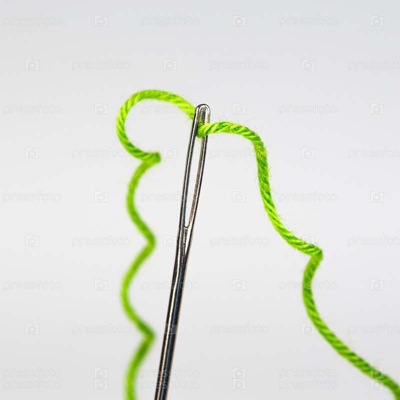 Зеленая нить продевается в игольное ушко. Крупный план с малой глубиной резкости