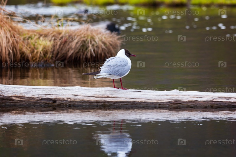 Терн сидит на бревне, на фоне воды и болотных кочек на заднем плане