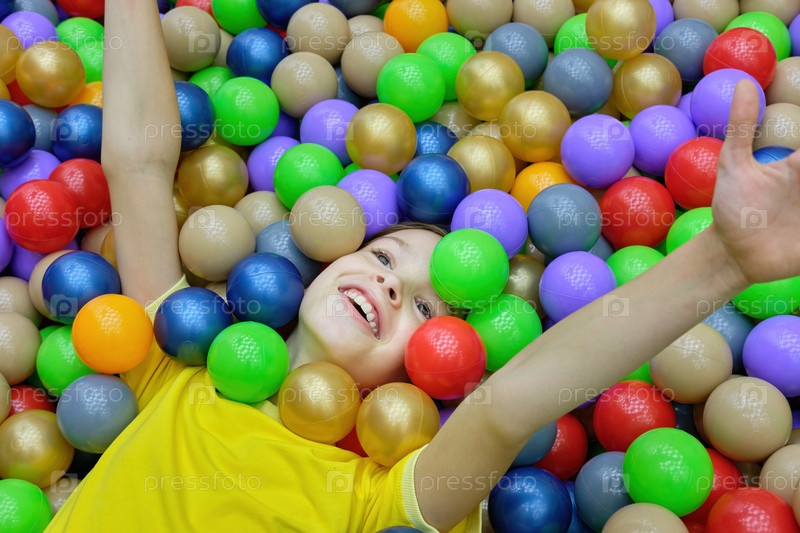 Счастливая девушка весело играет с разноцветными шариками в игровом центре