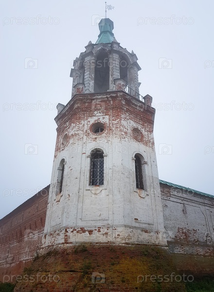 Башня старинного Спасо-Яковлевского православного монастыря в Ростове Великом осенним туманным утром. Объект культурного наследия