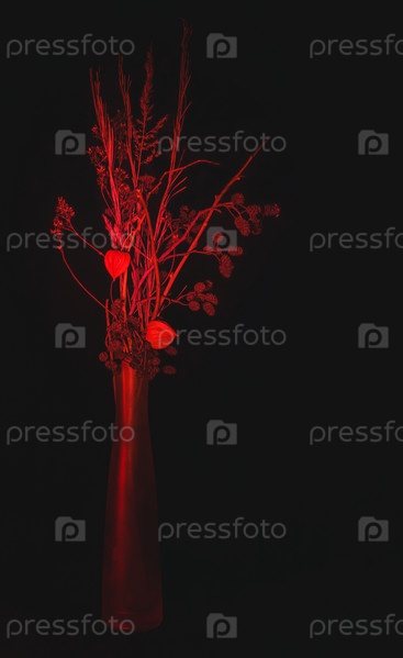 Красный букет сухих цветов в вазе на черном фоне