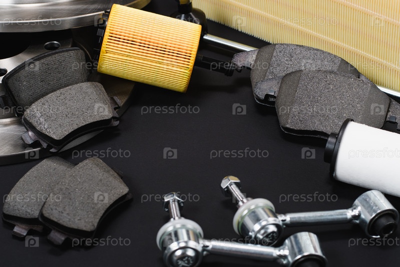 Автозапчасти на черном фоне. Свободное пустое место в центре. Селективный фокус на тормозных колодках