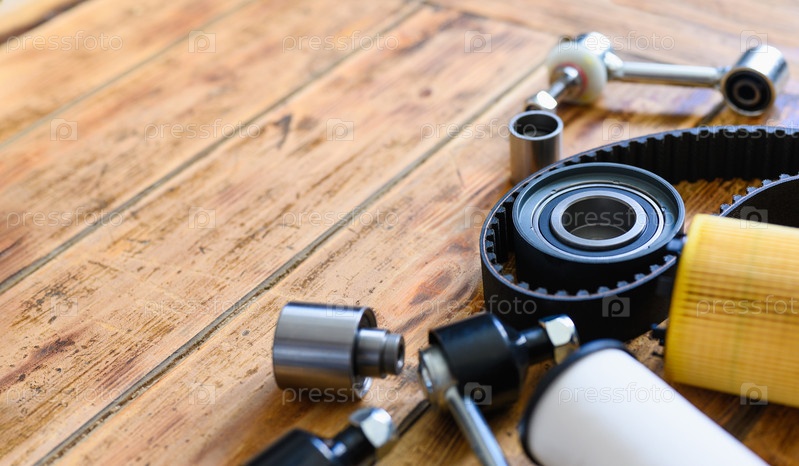 Автозапчасти крупным планом на деревянном столе. Селективный узкий фокус на подшипнике, свободное пространство слева