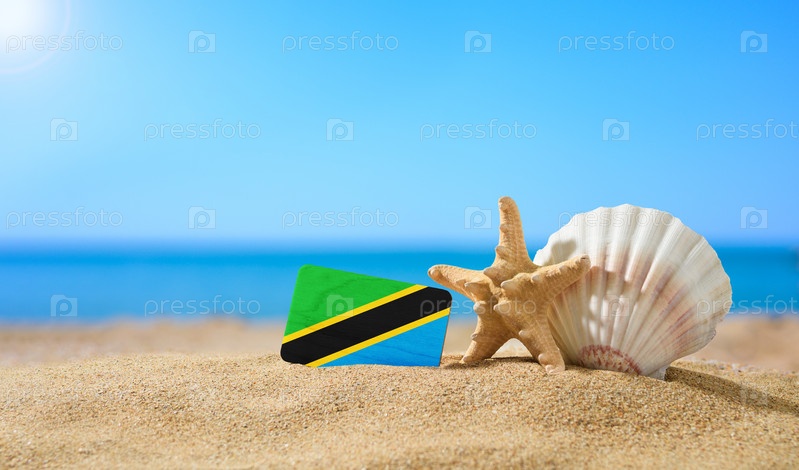 Тропический пляж с ракушками и флагом Танзании. Концепция райского отдыха на пляжах Танзании и островов Занзибар