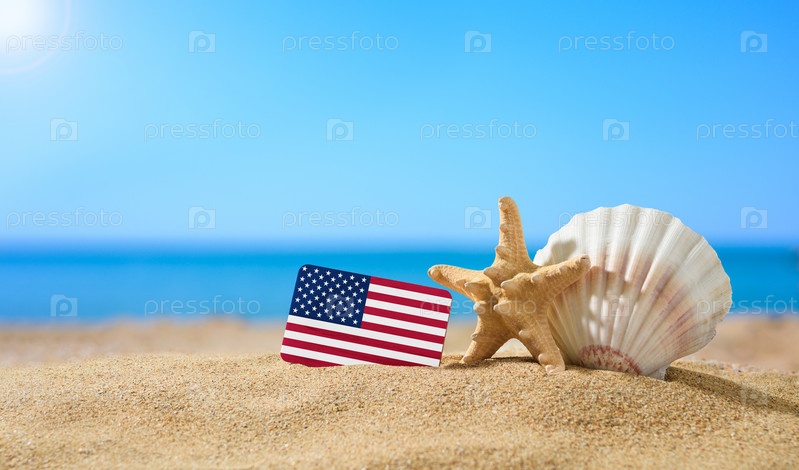 Тропический пляж с ракушками и флагом США. Концепция райского отдыха на пляжах США