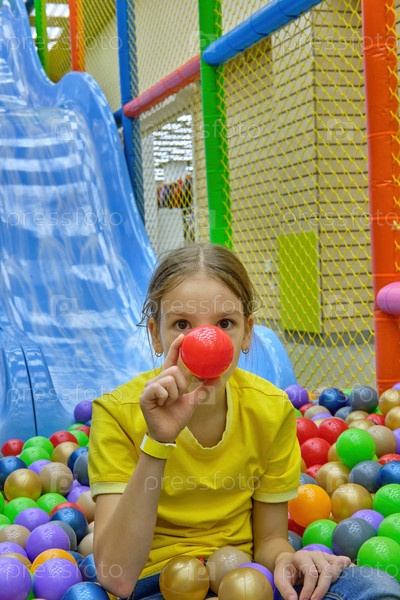 Забавная девочка весело играет с разноцветными шариками в игровом центре и катается с горки