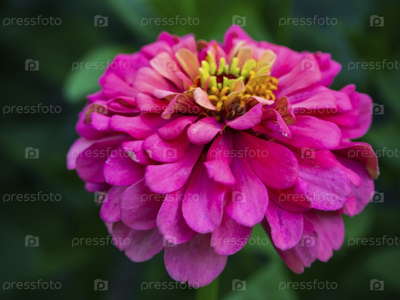 Розовый цветок цветущей циннии крупным планом на зеленом фоне летнего сада. Красивый бутон цветка с нежными лепестками. Мягкий фокус в центре. Натуральный необработанный экологически чистый цветок