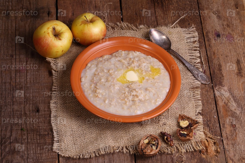 Овсяная каша с молоком,орехами и яблоками на деревянном столе