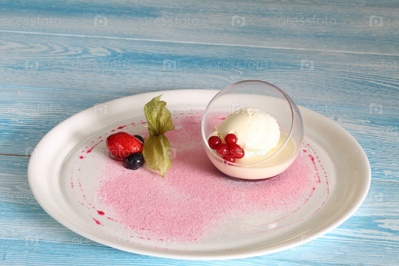 Панна-котта с клубникой, черникой и мятой на белом фоне