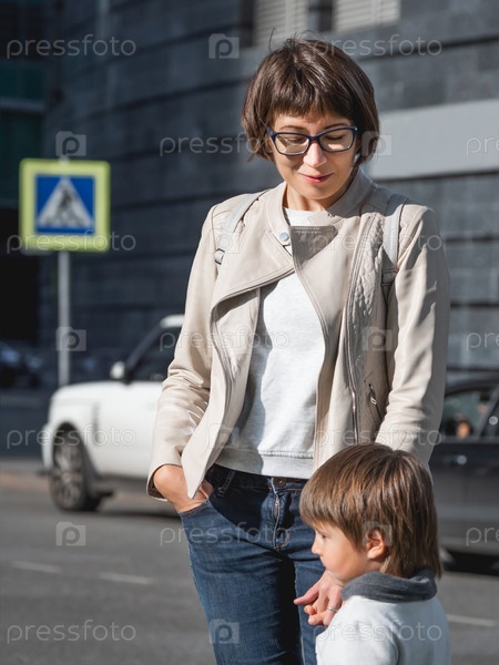 Мать и сын стоят на улице в солнечном свете. Женщина и ребенок в современном городе с транспортным движением и дорожным знаком. Семья в городе