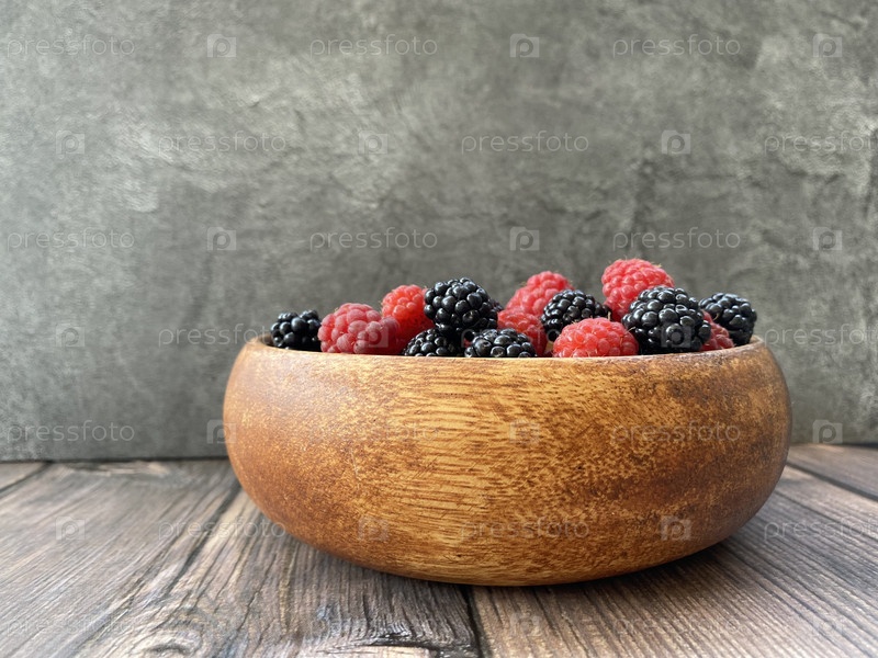 Деревянная миска с ягодами малины и ежевики на сером фоне