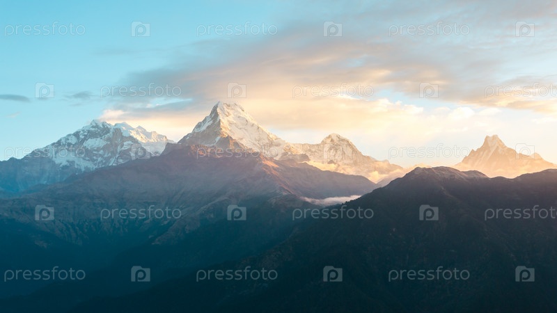 Горы Гималаев на восходе солнца. Могучие туманные снежные Гималаи, горный фон