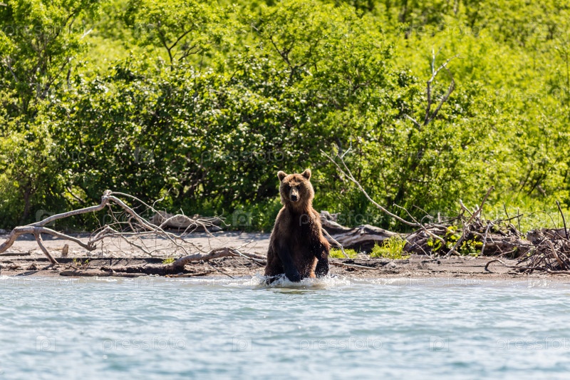Стоящий бурый медведь (Ursus arctos beringianus) ловит рыбу на Курильском озере. полуостров Камчатка, Россия