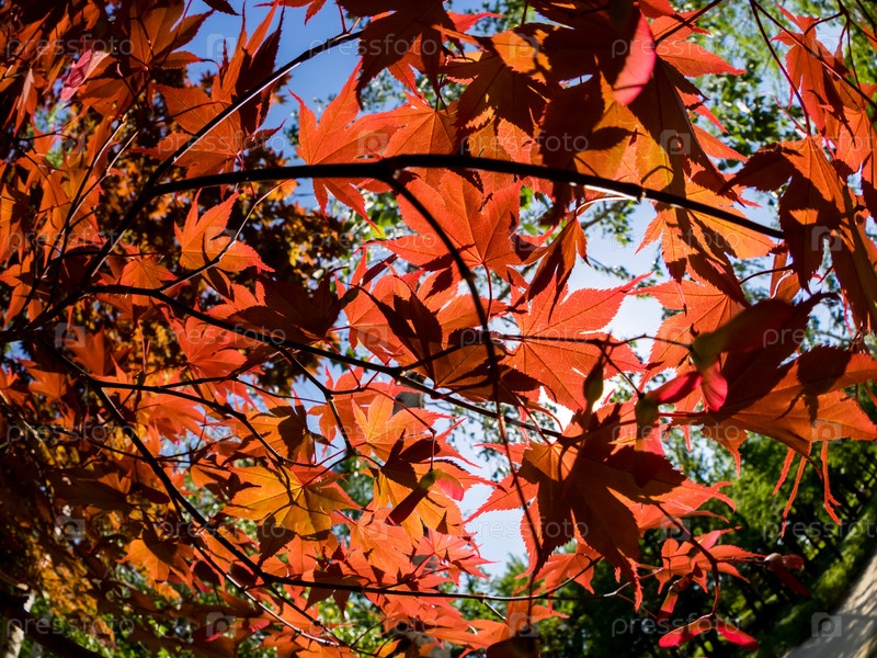Красные листья клена светятся в лучах солнца. Японский клен осенью. Вид снизу