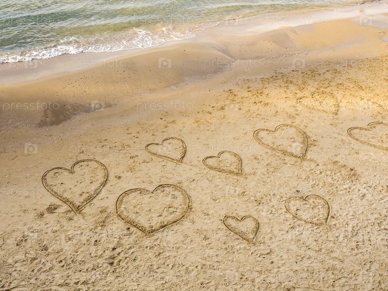 Символы сердец, рисующие на песке на пляже Тель-Барух. Набережная Тель-Авива. Израиль