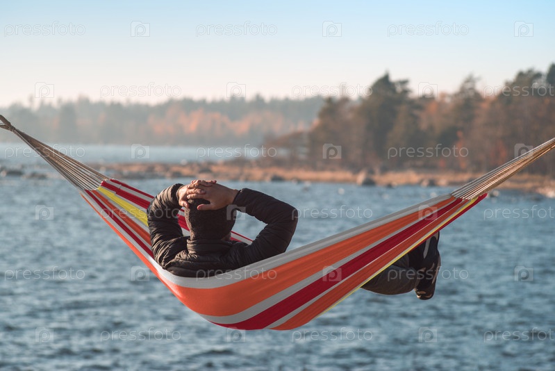 Мужчина сидит в гамаке у озера и любуется осенним лесом. Смарфон в руках
