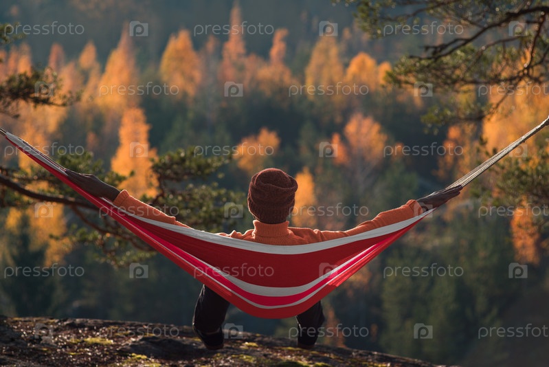 Мужчина сидит в гамаке и любуется осенним лесом. Вид со спины