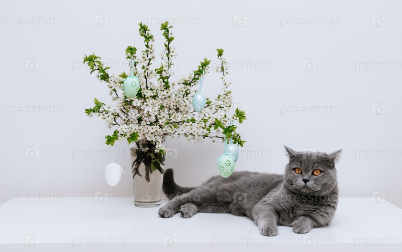 Британский короткошерстный кот и букет вишневых цветов с пасхальными яйцами. Пасхальная открытка