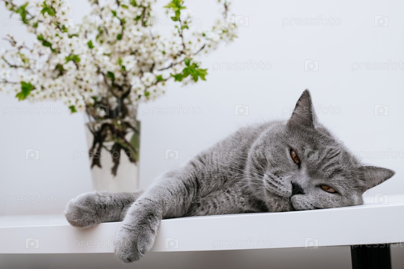 Сонный кот. Серый кот и букет вишневых цветов на белом фоне