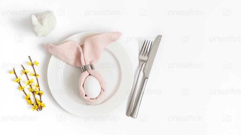Сервировка праздничного стола Пасхи с яйцом в розовой салфетке Пасхальный кролик и желтые цветы форзиции на белом фоне