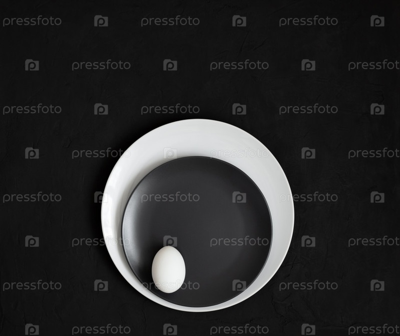 Черная минимальная пасхальная концепция. Белое куриное яйцо на черной белой тарелке на темном фоне