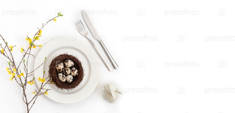 Сервировка пасхального стола с перепелиными яйцами в гнезде, веткой желтого цветка форзиции и кроликом на белом фоне