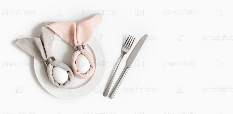 Пасхальная концепция с яйцом в салфетке пасхального кролика на белом фоне. Праздничная сервировка стола