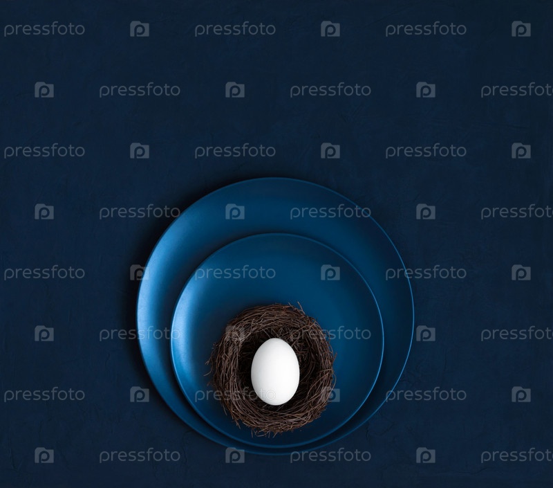 Пасхальная минималистская концепция. Куриное яйцо в гнезде на классическом синем фоне