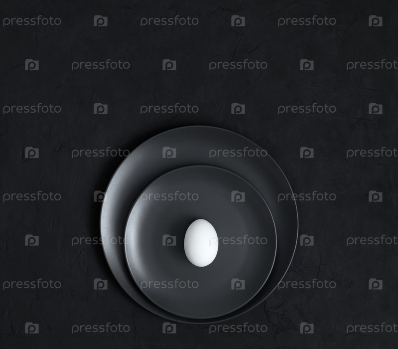 Белое яйцо на черных тарелках на темном фоне. Черная минимальная концепция. Сервировка пасхального стола