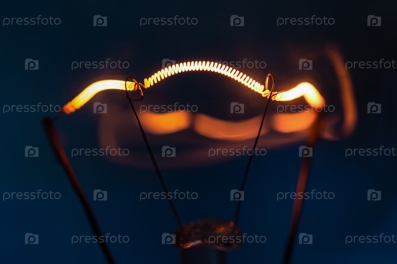 Светящаяся нить лампы накаливания крупным планом на темно-синем фоне