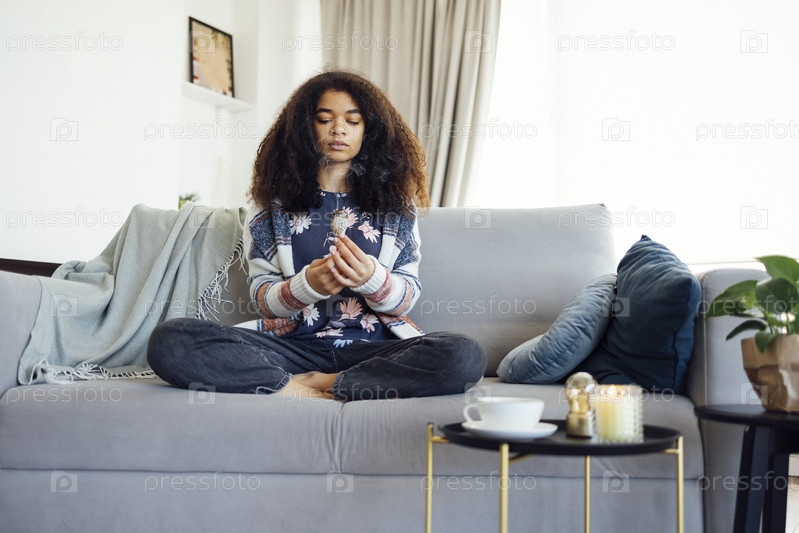 Афроамериканка сжигает шалфейную палочку и пахнет дымом на серой стене во время медитации