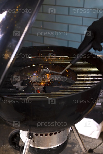 Мужчина держит газовую горелку с воздушным шаром и разводит огонь на гриле
