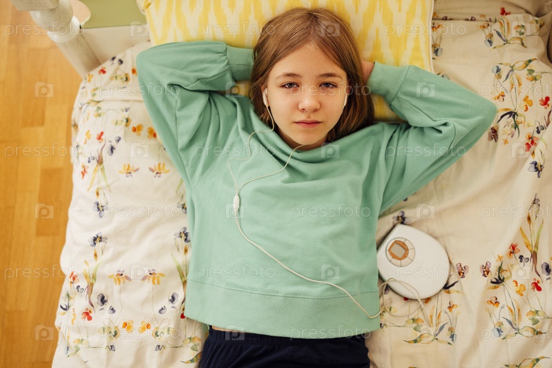 Девочка-подросток показывает компакт-диск и слушает музыку в своей комнате