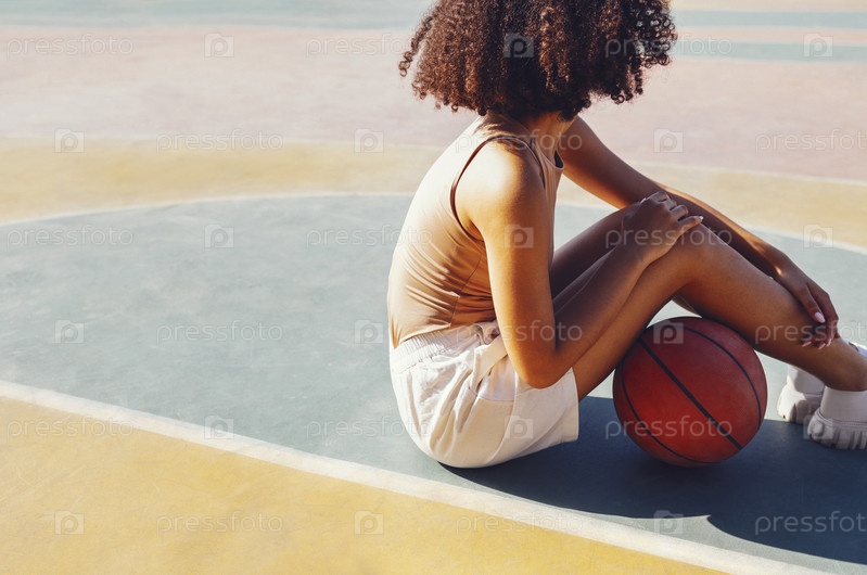 Стильная крутая девушка-подросток собирается на баскетбольной площадке, играет в баскетбол на открытом воздухе