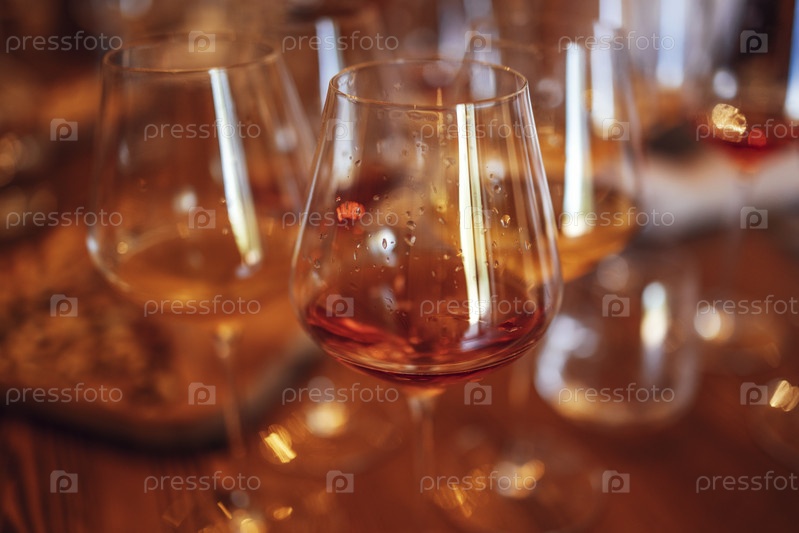 Стеклянные бокалы, расставленные рядами на столе во время процедуры дегустации вин в ресторане