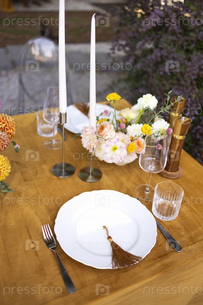 Прически и стол для гостей, украшенный свечами, сервируется столовыми приборами и посудой
