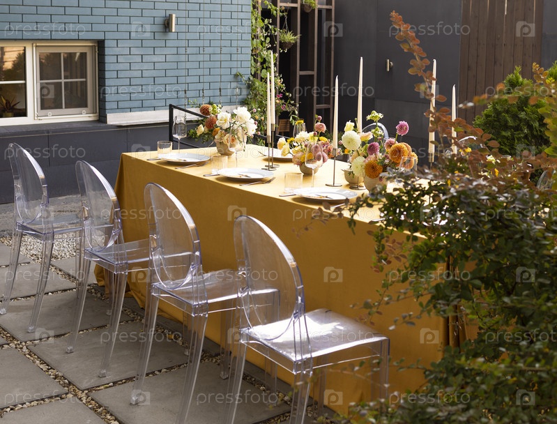 Прически и стол для гостей, украшенный свечами, сервируется столовыми приборами и посудой