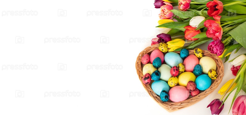 Пасхальные украшения. Окрашенные красочные яйца в корзине и букет тюльпанов, изолированные на белом фоне. Баннер. Место для текста