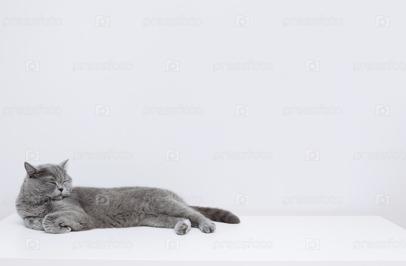 Британская короткошерстная кошка спит на столе. Спящая кошка на белом фоне. Скопируйте пространство
