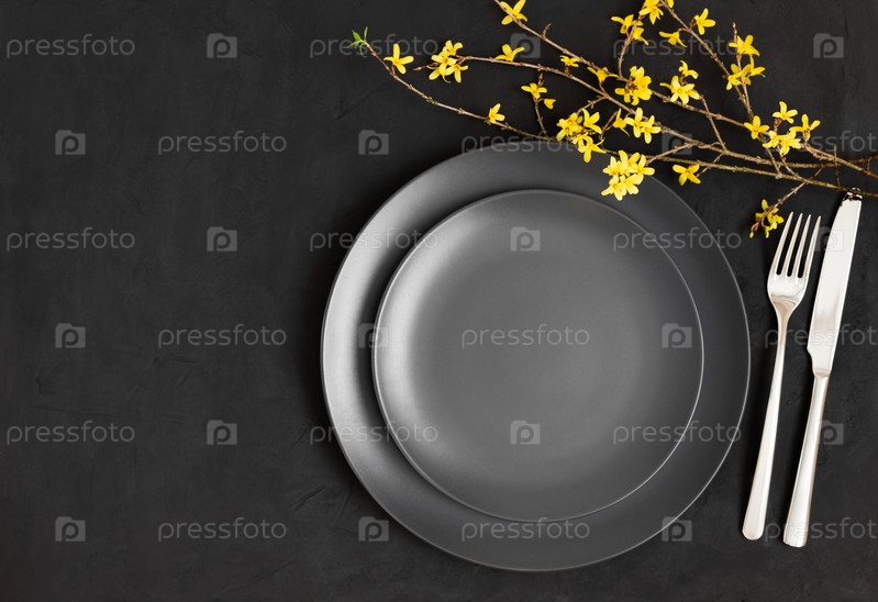 Черная сервировка стола. Желтые цветы и черная тарелка на темно-сером фоне. Пасха. Место для текста. Вид сверху, плоская планировка