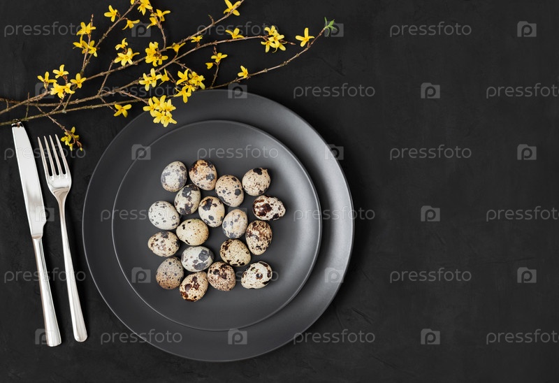 Сервировка пасхального стола с маленькими перепелиными яйцами и желтыми цветами форзиции на черном фоне. Место для текста