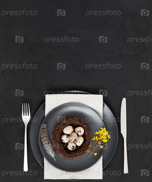 Сервировка пасхального стола с гнездом из перепелиных яиц, пером, салфеткой и желтыми цветами на черном фоне. Вертикальная ориентация