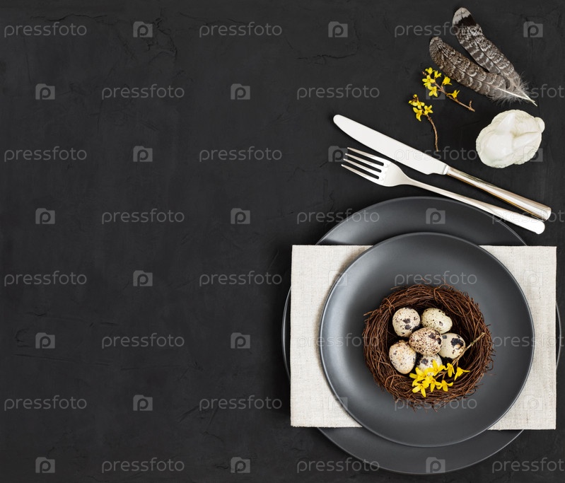 Сервировка темного пасхального стола с гнездом из перепелиных яиц, салфеткой, перьями, кроликом и желтыми цветами на черном фоне