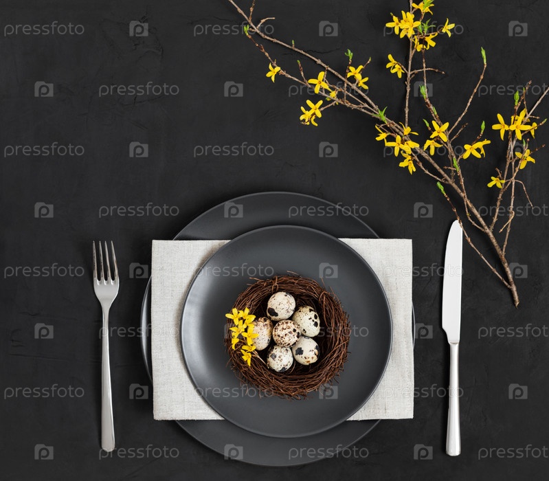Сервировка пасхального стола с гнездом перепелиных яиц, салфеткой и желтыми цветами на черном фоне