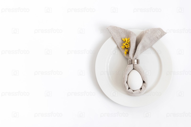 Сервировка пасхального стола с яйцом в серой салфетке Пасхальный заяц и ветка желтых цветков форзиции на белом фоне