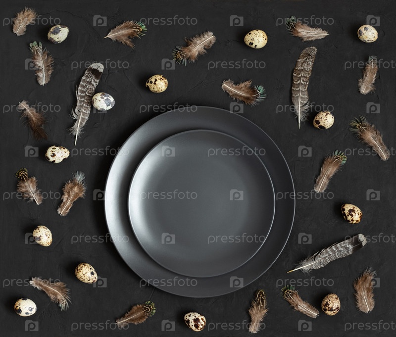Пасхальная темная сервировка стола с перепелиными яйцами в гнезде на черном фоне. Пасхальный узор