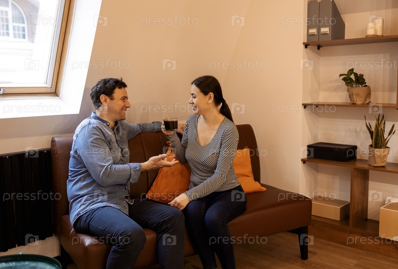 Счастливые муж и жена отдыхают на удобном диване в гостиной и наслаждаются чаепитием