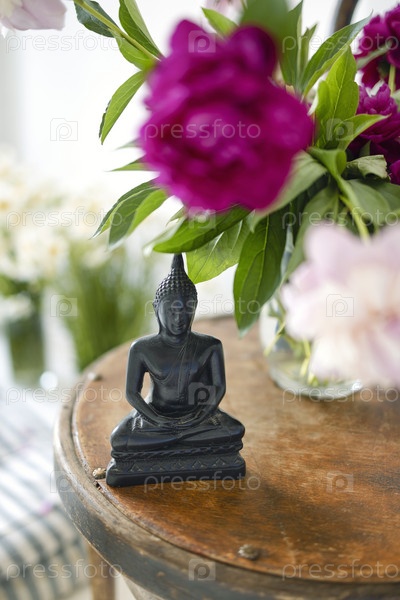 Фигура Будды из черного камня на фоне уютной светлой комнаты